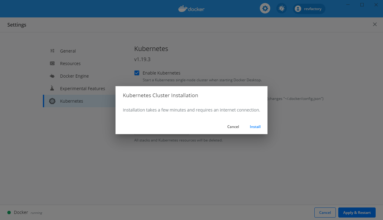 8. Docker Desktop 의 설정에서 Kubernetes를 선택하여 아래와 같이 옵션을 켜 줍니다.