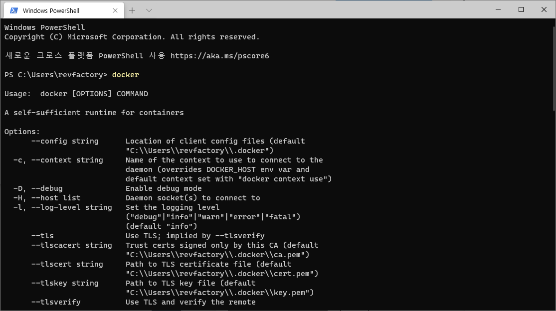 6. Windows Terminal 을 실행해 아래와 같이 docker 명령어를 실행해 봅니다.