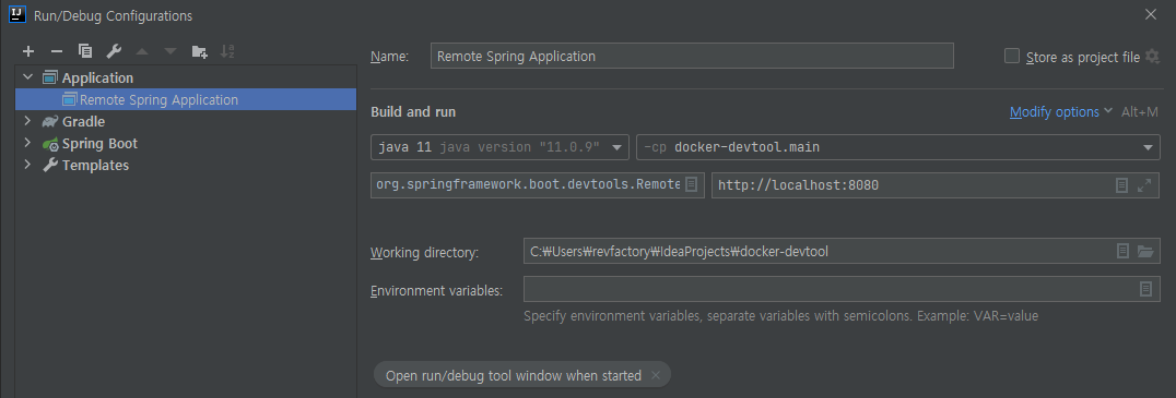 일반적으로 도커 이미지를 생성하고 난 후에 코드 변경사항이 생기면 다시 도커 이미지를 빌드하고 도커에 올려야 하지만 DevTool 은 프로젝트가 빌드되었을때 실시간으로 도커에 변경사항을 반영해 준다.