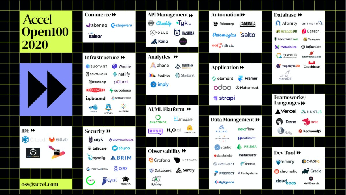 그 결과 애플리케이션 전반에 걸쳐 OSS 스타트업이 폭발적으로 증가했습니다. 이 분야의 장기 투자자인 Accel은 커뮤니티 성장, 상업적 발전 및 혁신적인 접근 방식을 측정하여 오픈소스에서 가장 빠르게 성장하는 스타트업 모음인 Open 100을 통해 진행상황을 연결하기로 결정했습니다.
