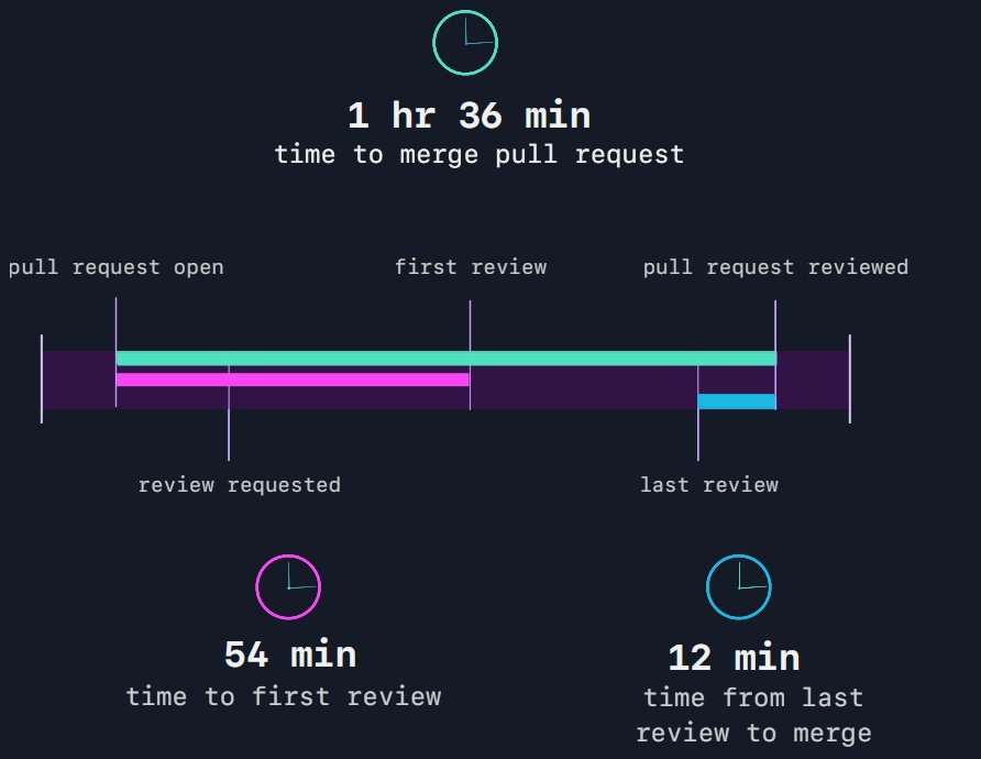 - 보통 개발자는 하루에 4개의 커밋을 수행 - Pull Request 후 머지가 될때까지 평균 1시간 36분 소요 - Pull Request 후 보통 54분 후 첫 리뷰가 발생 - 마지막 Review가 되고나서 평균 12분 후 머지가 발생 - 대부분의 경우 Pull Request 리뷰어는 1명이었으며, 추가 검토자가 있는 경우 시간이 더 걸림