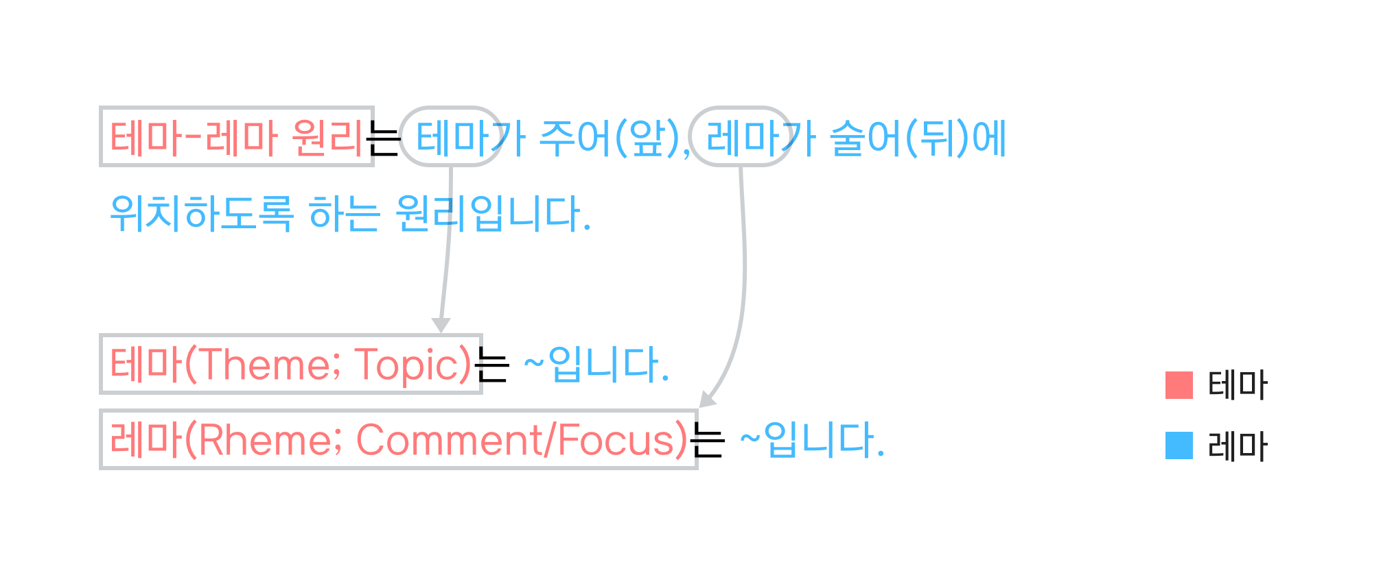 테마-레마 원리는 어순이 자유로운 언어에서 테마가 주어(앞), 레마가 술어(뒤)에 위치하도록 하는 원리입니다. 테마(Theme; Topic)는 청자/독자의 일반지식에 속하는 보편적인 정보로, 상황이나 문맥에 주어져 있는 알려진 정보입니다. 반면 레마(Rheme; Comment/Focus)는 테마에 관련된 새로운 정보입니다. '테마' 및 '레마'라는 단어에서 보여지듯 이는 독일에서 온 말입니다. 독일어는 영어에 비해 어순이 자유롭기 때문에 테마-레마 원리에 대한 연구가 활발하게 이루어지고 있습니다.