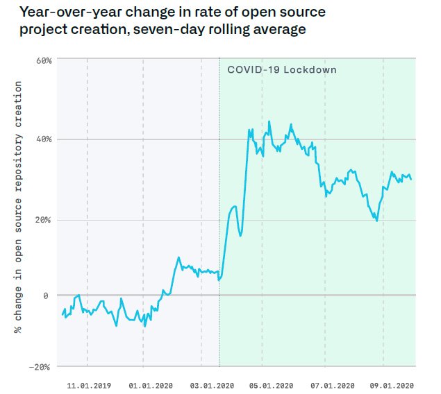 이것은 우리에게 무엇을 말해줄까요? 이는 사람들이 특히 세계의 많은 사람들이 집에 머물게 되면서 창조하고, 배우고, 공유하기 위해 오픈 소스로 눈을 돌리고 있음을 나타냅니다. 또한 많은 사람들이 기술이 피로하게 만들 수 있다고 경고하지만, 이러한 패턴은 오픈 소스가 Workplace와는 눈에 띄게 다른 창의적인 배출구와 휴식을 제공할 수 있음을 보여줍니다.