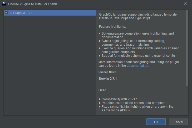 - schema.graphqls 파일을 생성하니 JS GraphQL IntelliJ plugin 을 추천해준다. 설치하자.