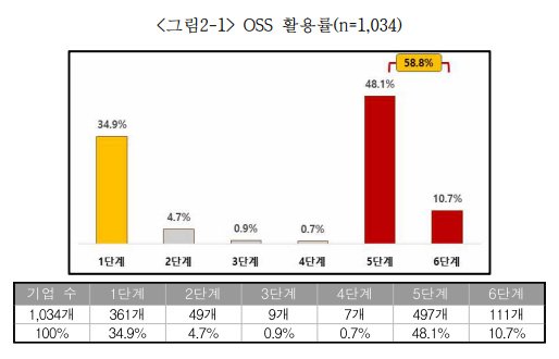 - 국내기업의 OSS 활용률은 58.8%(5단계 48.1%+6단계 10.7%)로 나타남