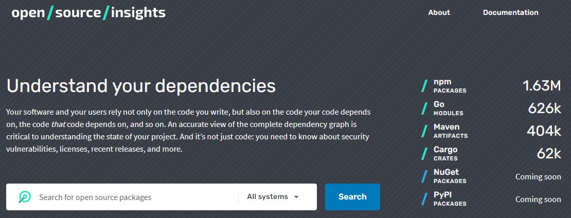 Open Source Insights는 개발자가 오픈 소스 소프트웨어 패키지의 구조, 보안 및 구성을 더 잘 이해할 수 있도록 Google에서 개발하고 호스팅하는 실험적인 서비스입니다. 이 서비스는 각 패키지를 검사하고 종속성 및 속성에 대한 전체적이고 상세한 그래프를 구성하며 그 결과를 혜택을받을 수있는 모든 사람에게 제공합니다.