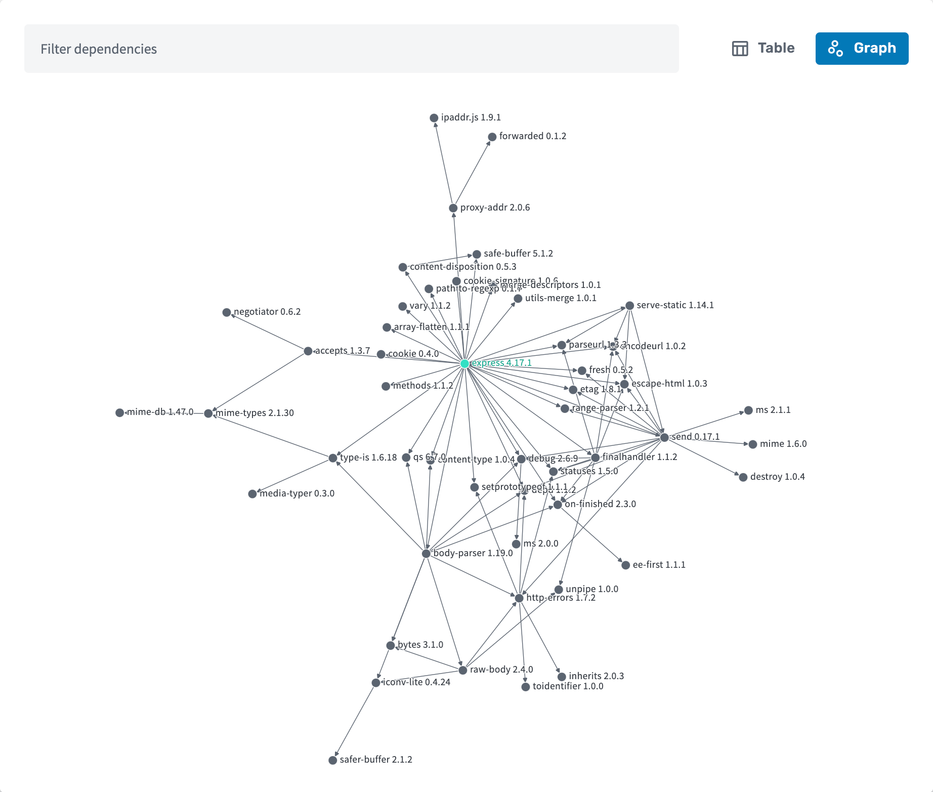 데이터는 프로젝트 자체 코드뿐만 아니라 각 종속성의 개별 버전에 이르기까지 프로젝트의 모든 종속성에 대해 완전히 구성된 그래프의 모든 패키지에 대해 제공됩니다. 예를 들어 소프트웨어가 취약성이있는 종속 패키지 버전에 의존하는 경우 취약성이 프로젝트의 Insights 웹보기에서 최상위 수준에 표시됩니다.