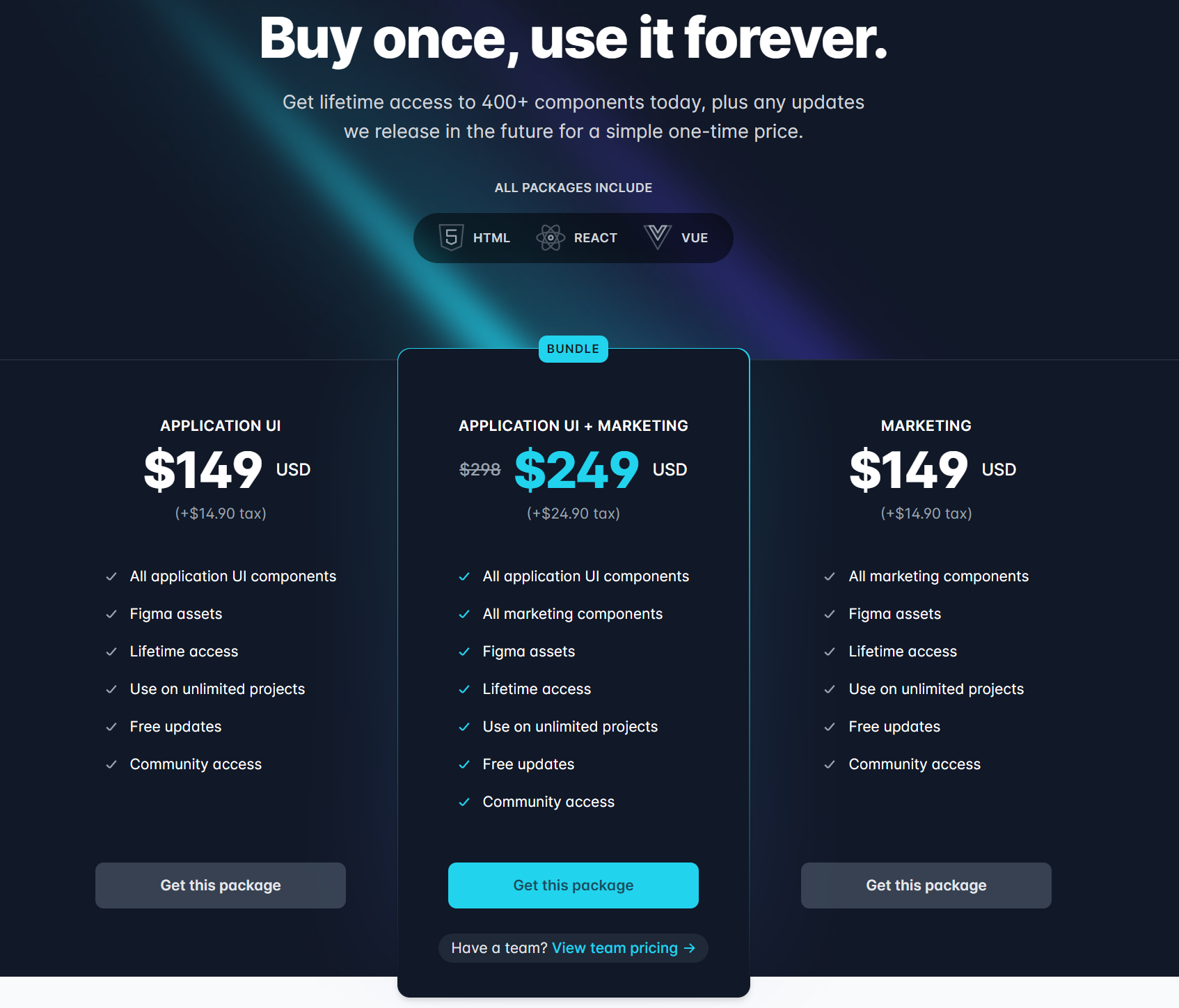 다만 주의해야 할 점은 TailwindCSS 에서 제공하는 대다수의 완성된 UI 컴포넌트가 Tailwind UI라는 별도의 제품으로 유료로 제공된다는 점이다. 따라서 구매없이 사용하려면 결국 TailwindCSS 를 이용해서 직접 레이아웃을 구성하고, 컴포넌트를 제작해야 한다. Tailwind UI 에는 Figma 키트도 포함되어 있으며, 1회 구매로 계속 업데이트를 받을 수 있다고 한다. 팀 라이선스는 좀 더 높은 가격으로 제공하고 있다. Tailwind UI 로 만든 템플릿, 테마는 재판매할 수 없도록 라이선스를 규정하고 있다. Github에 Tailwind UI 컴포넌트를 포함한 소스코드를 공개해서도 안된다. 그밖에도 여러 제약이 있으니 Tailwind UI 를 사용하고자 한다면 잘 살펴보아야 할 것 같다. 개인적으로 Bootstrap 처럼 컴포넌트들은 제공하고, 완성된 사이트를 판매하는 형태로 갔었으면 하는 아쉬움이 남는다.
