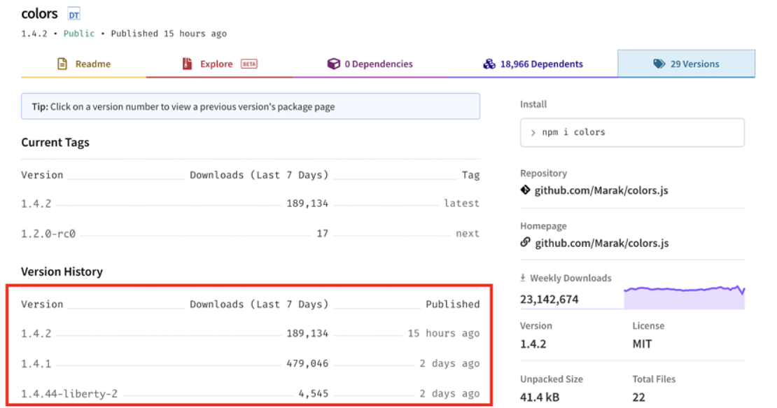 colors.js 는 2년전 1.4.0 버전을 릴리즈 이후, 업데이트가 없다가 최근 LIBERTY LIBERTY LIBERTY 출력과 함께 비 아스키 문자를 출력 하는 무한 루프 동작을 추가한 1.4.1 과 1.4.2 버전을 릴리즈했습니다. 이는 colors.js 초기화 구문에 삽입되어 있으며 colors.js 의 새로운 버전을 포함하여 배포하거나 실행시에 문제가 즉시 나타납니다. 이 상황을 미처 알지 못한 많은 개발자들은 서비스를 배포할때 이 문제에 직면하게 되었습니다.