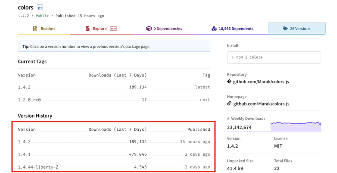 faker는 소스 코드가 포함되지 않은 빈 패키지로 6.6.6 버전이 릴리즈 되었으며, 2만건 정도 다운로드가 이뤄졌지만 별다른 조치는 없었습니다.