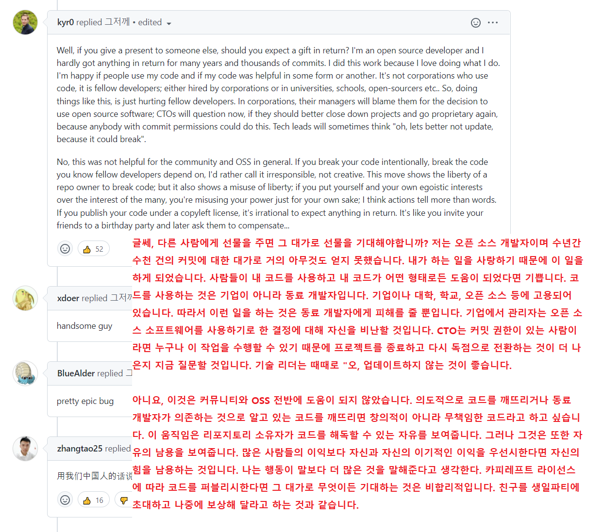 현재 colors.js 의 Github 에서 문제의 문자열을 남기는 LIBERTY 문구가 포함된 american.js 파일에는 수 많은 개발자들이 찾아와서 코멘트를 남기고 있습니다. Github에서 이렇게 긴 스크롤을 갖는 코멘트 행렬은 처음 봅니다.