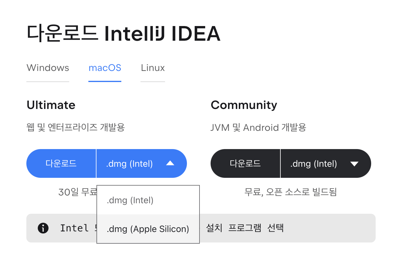 - 다운로드 : https://www.jetbrains.com/ko-kr/idea/download/#section=mac