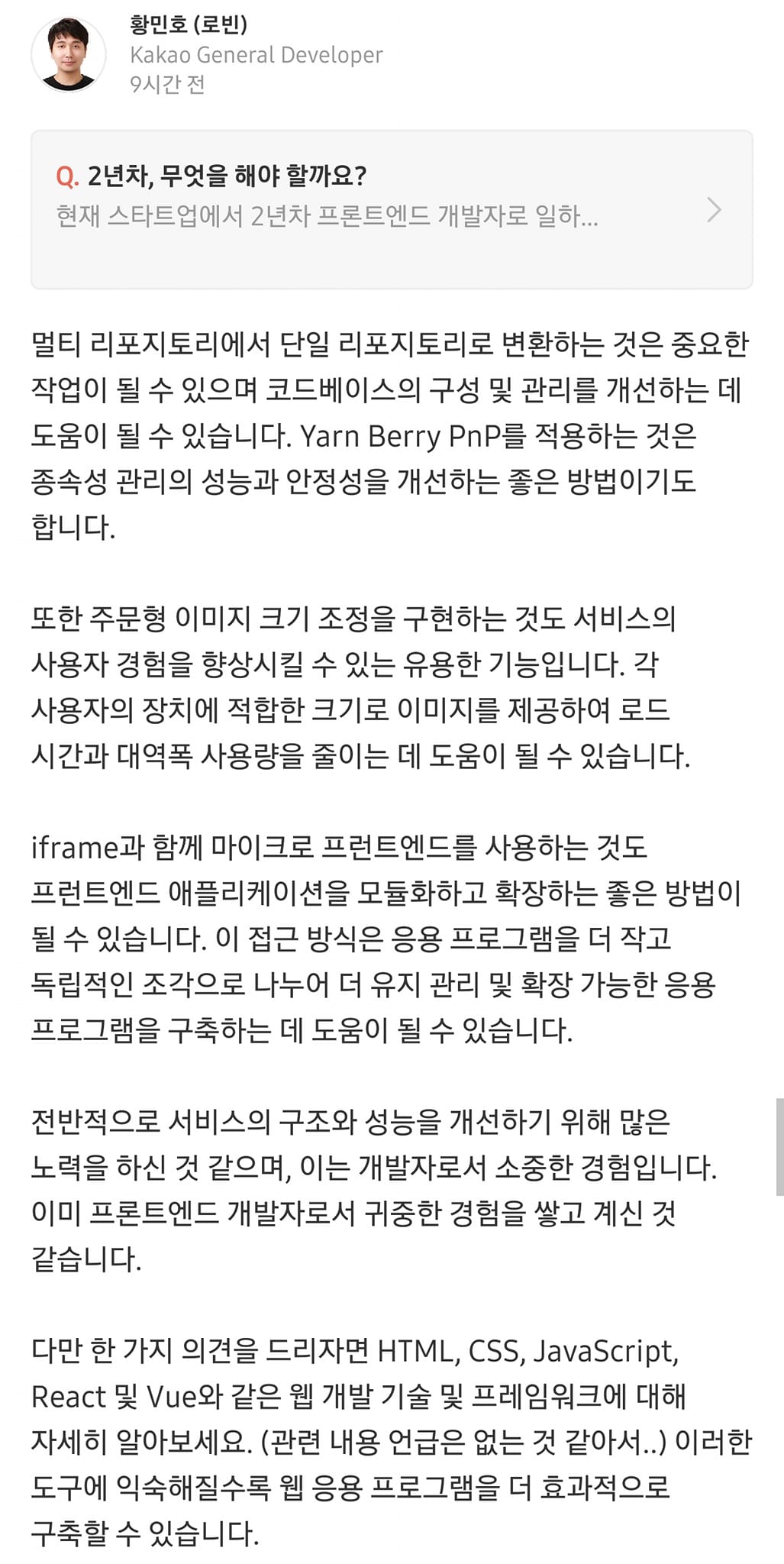 주말 동안 저는 온라인 커뮤니티에서 인공지능(AI) 도구인 chatGPT를 사용하여 질문에 답할 기회를 가졌습니다. 저는 기술적인 질문과 경력 및 개인적인 조언에 대한 요청을 포함하여 광범위한 질문을 이해하고 응답하는 chatGPT의 능력에 깊은 인상을 받았습니다. 영어가 항상 완벽하지는 않았지만 한국어로 쓰여진 질문도 자동으로 영어로 번역되어 chatGPT가 이해했습니다.