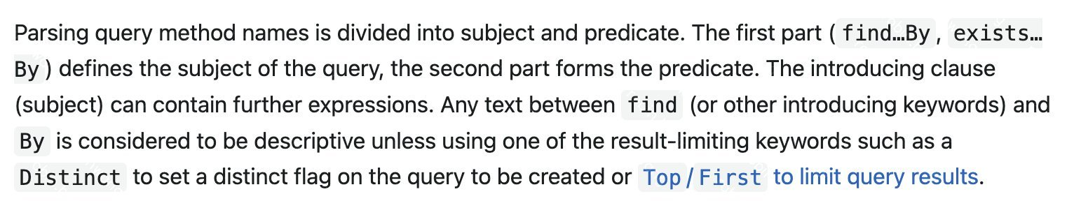 따라서 지정된 단일 결과를 찾으려면 find 와 by 사이에 First 나 Top 과 같은 키워드를 추가해서 사용해야 합니다.