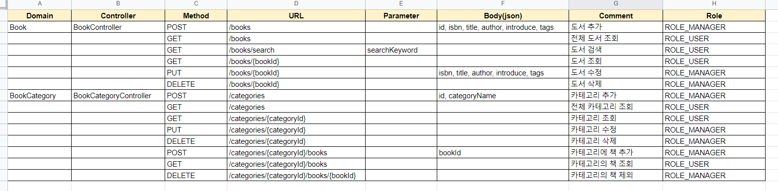 BookCategory,BookCategoryController,POST,/categories,,"id, categoryName",카테고리 추가,ROLE_MANAGER