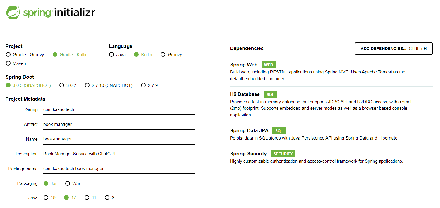 샘플에서는 Spring Boot와 코틀린으로 작성된 도서 관리 서비스 프로젝트를 만들꺼예요.