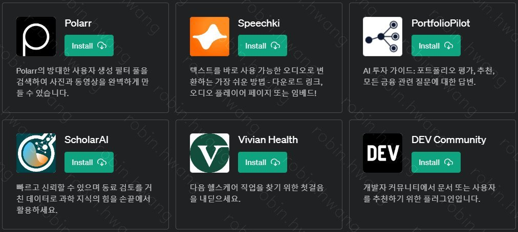 쇼핑, 예약, 정보검색, SMS전송, 주식, 가상화폐, 게임에 이르기까지 다양한 Plugin 이 등록되어 있습니다. Plugin 은 현재 최대 3개까지 동시 활성화 가능하며, 영역이 겹치는 버티컬 서비스끼리는 동시에 활성화가 안됩니다.