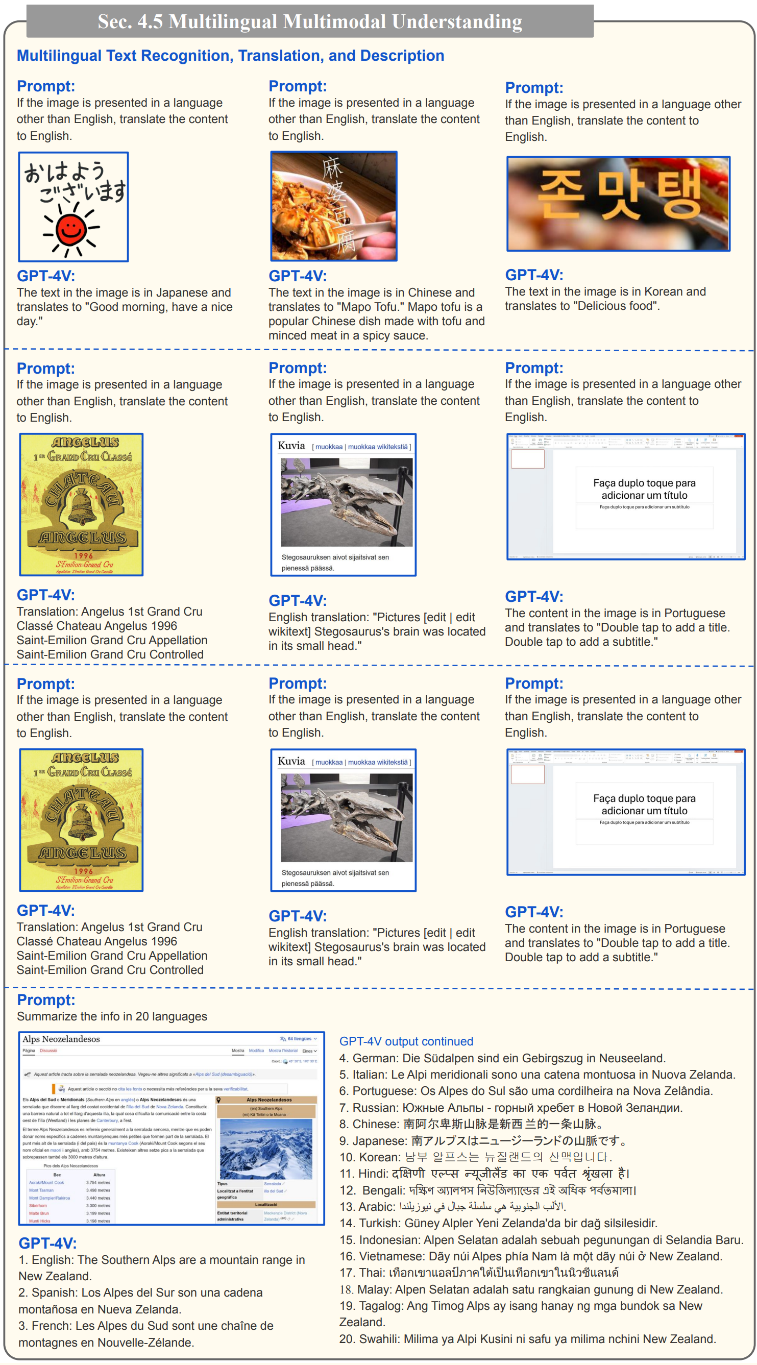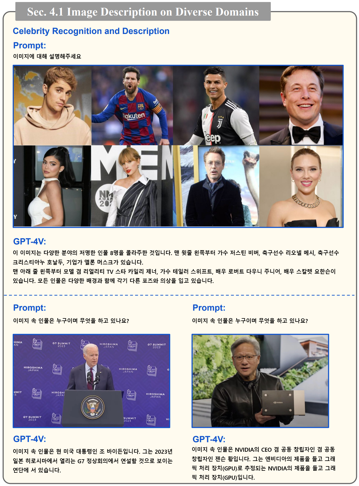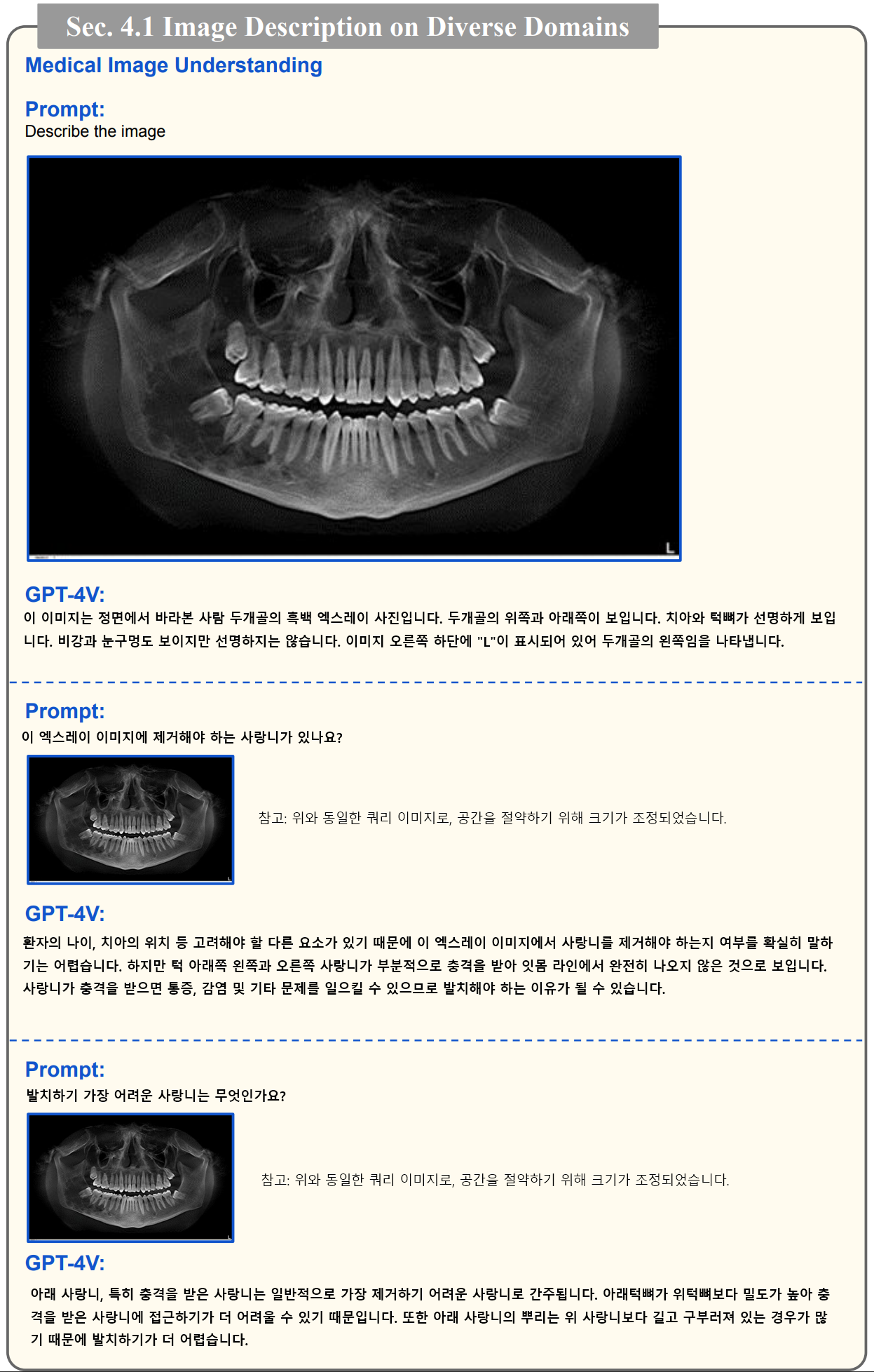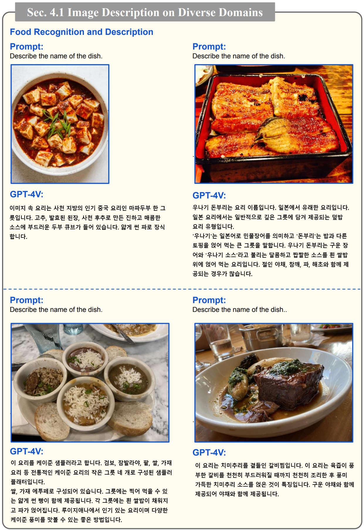 이 논문에서는 세부 카테고리별로 프롬프트와 이미지를 통한 GPT-4V 의 결과를 소개하고 있으며, 무려 124개의 이미지 사례를 포함하고 있습니다. 여기서는 모든 사례를 소개할 수 없으므로 한번쯤은 해당 논문을 참고하여 살펴보시는 것을 권장드립니다.