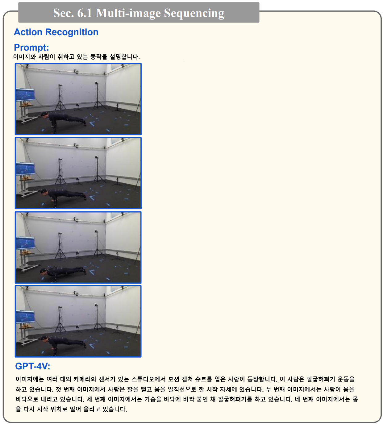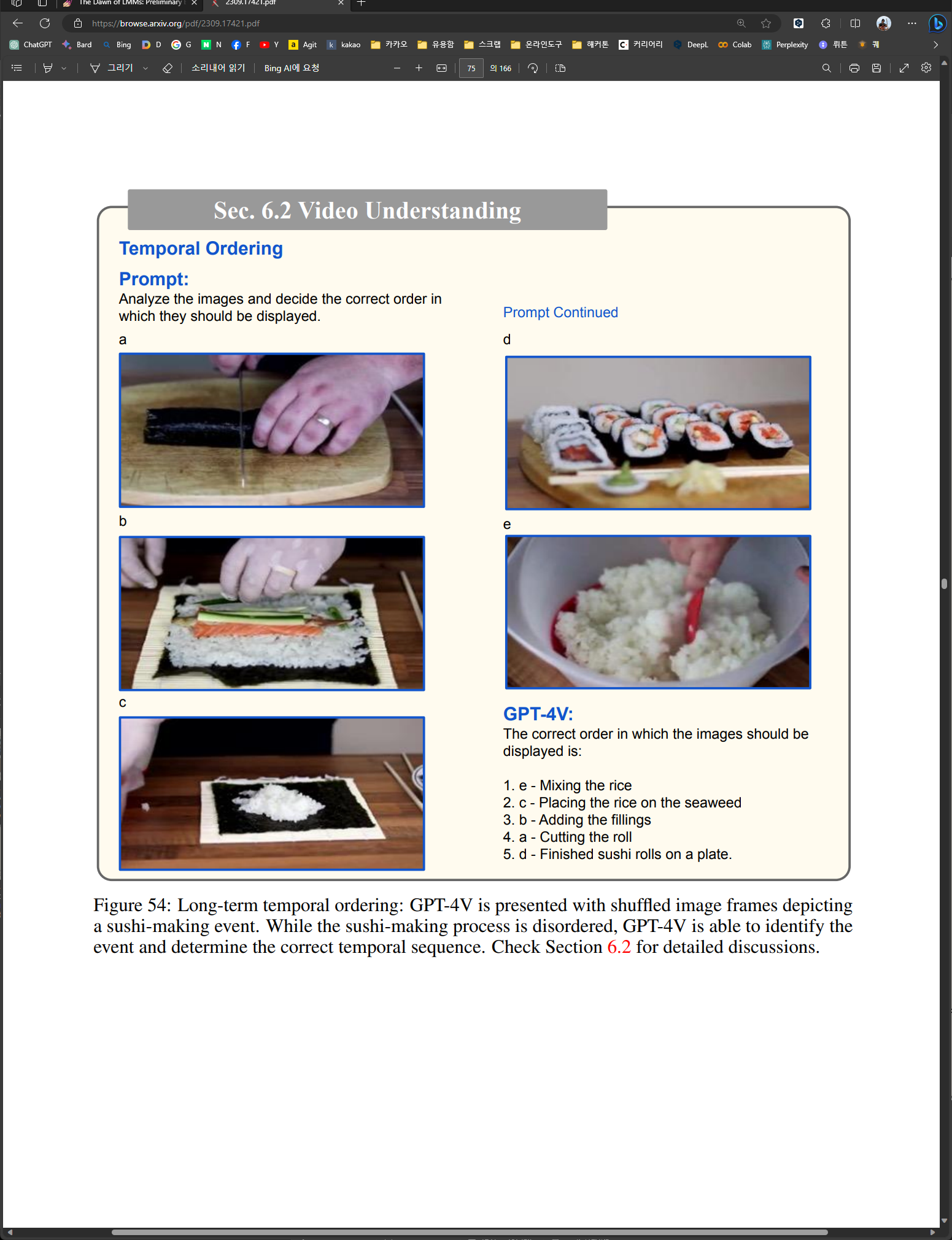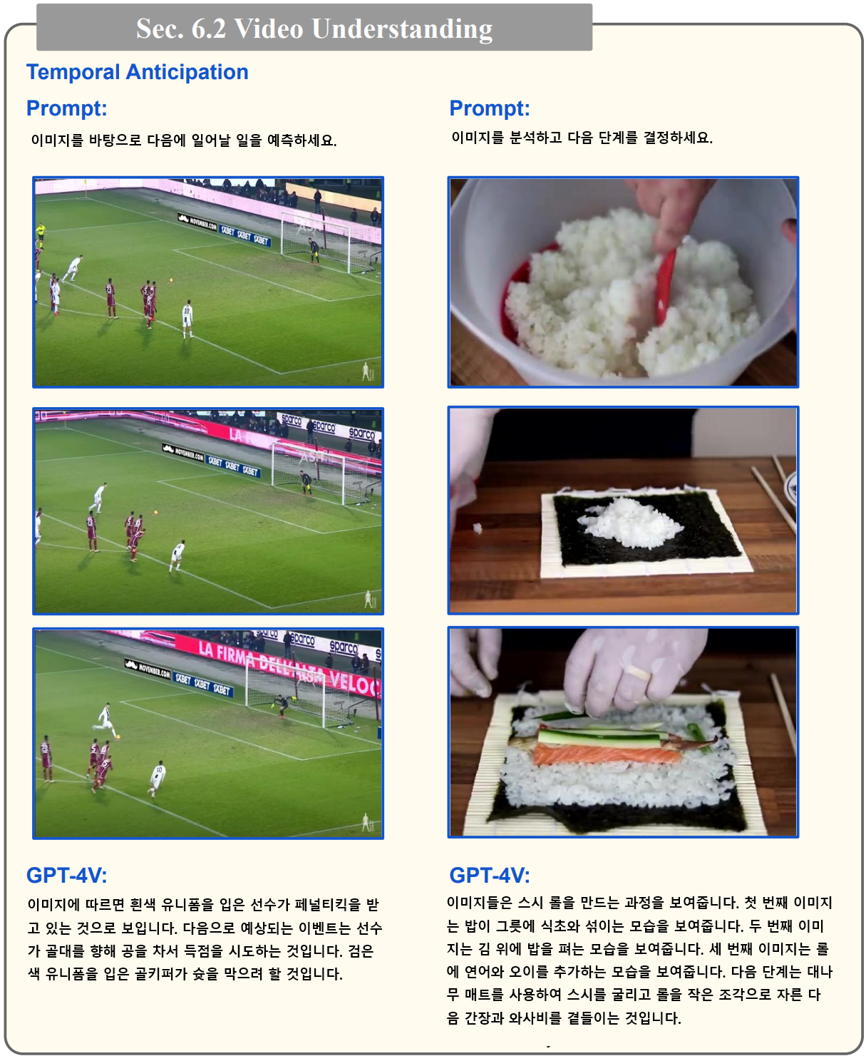 - 또한 아래 예시와 같이 일련의 초기 프레임이 주어졌을 때, GPT-4V가 미래 이벤트를 예측하는 테스트도 꽤 잘 응답하는 것을 확인 할 수 있습니다. GPT-4V는 다양한 시간 구조와 복잡성을 가진 활동을 포착하고 이해할 수 있음을 알 수 있습니다.