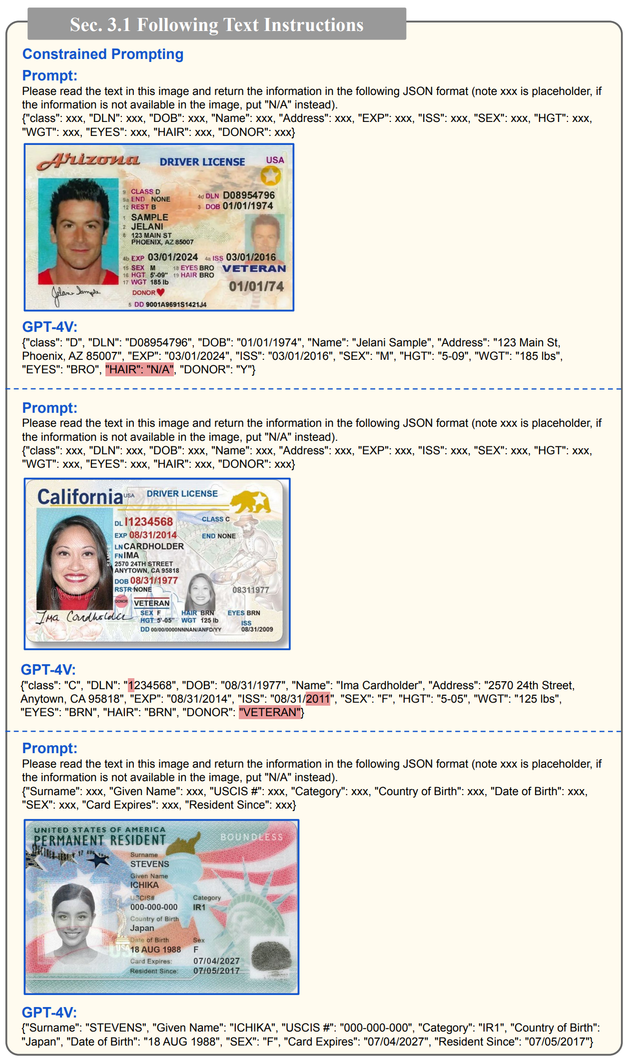 - 아래 예시는 이미지에서 정형화된 JSON 형식을 반환받는 예제 입니다. 단, 빨간색은 오답을 나타냅니다.