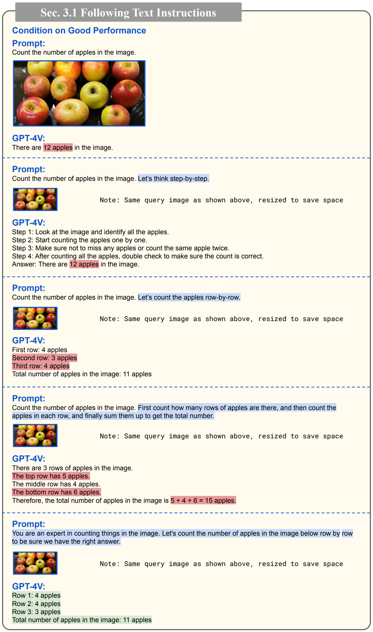 - 아래 예시는 이미지 속 사과 갯수를 세는 예시입니다. 이미지에는 11개의 사과가 있지만 상단 이미지가 잘려서 GPT-4V 는 12개 사과가 있다고 잘못 알려주고 있습니다. 이 경우, 프롬프트 수정만으로 11개로 올바르게 인식할 수 있을까요? 만능 키워드로 알려진 "Let's think step-by-step" 도 무용지물이네요.