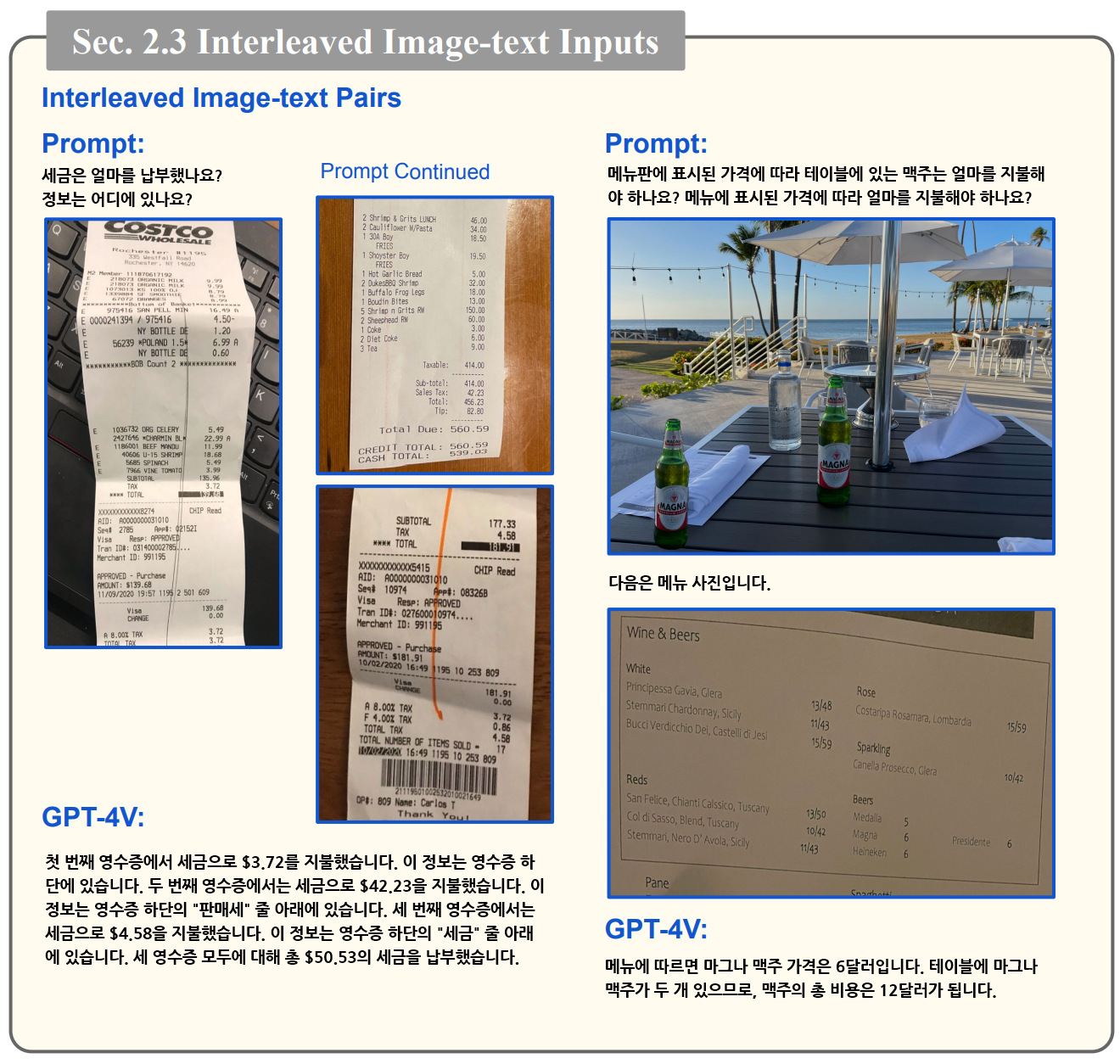 - GPT-4V 에서는 텍스트 입력 뿐만 아니라 한 개 이상의 이미지와 텍스트를 함께 입력할 수 있게 됩니다.