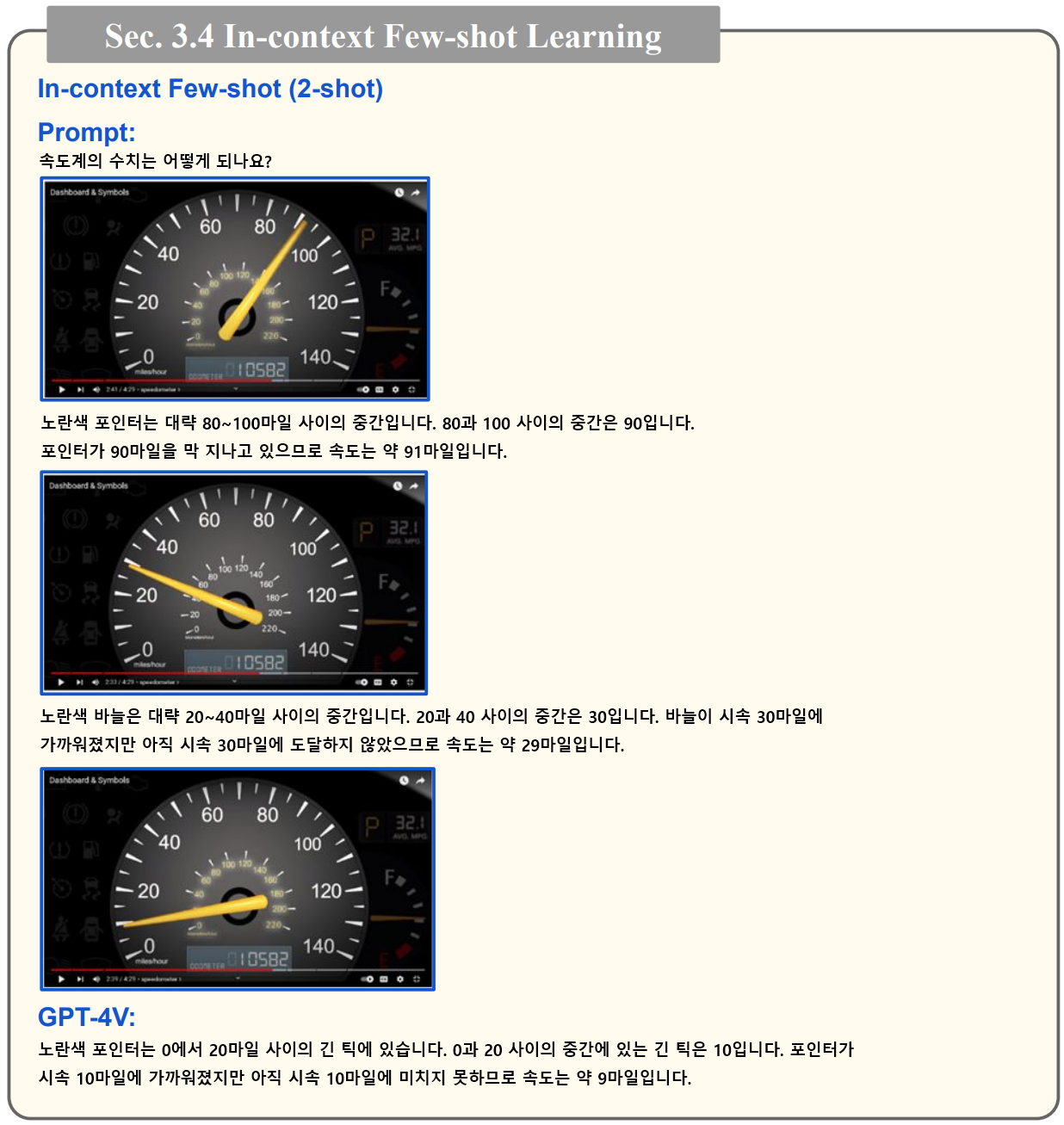 - 아래 예시는 계기판 이미지를 인식할 수 있는지에 대한 테스트입니다. 처음에는 계기판 이미지를 올바르게 인식하지 못합니다. 또한 이미지에 대한 설명을 추가해도 인식이 안되는 것으로 확인됩니다. 하지만 아래와 같이 90마일인 경우, 29마일인 경우 이렇게 몇 가지 예시를 추가로 제공함으로써 Few-shot Learning 이 가능하다고 합니다. 물론 모든 상황에 항상 가능한 것은 아니라고 하는군요.
