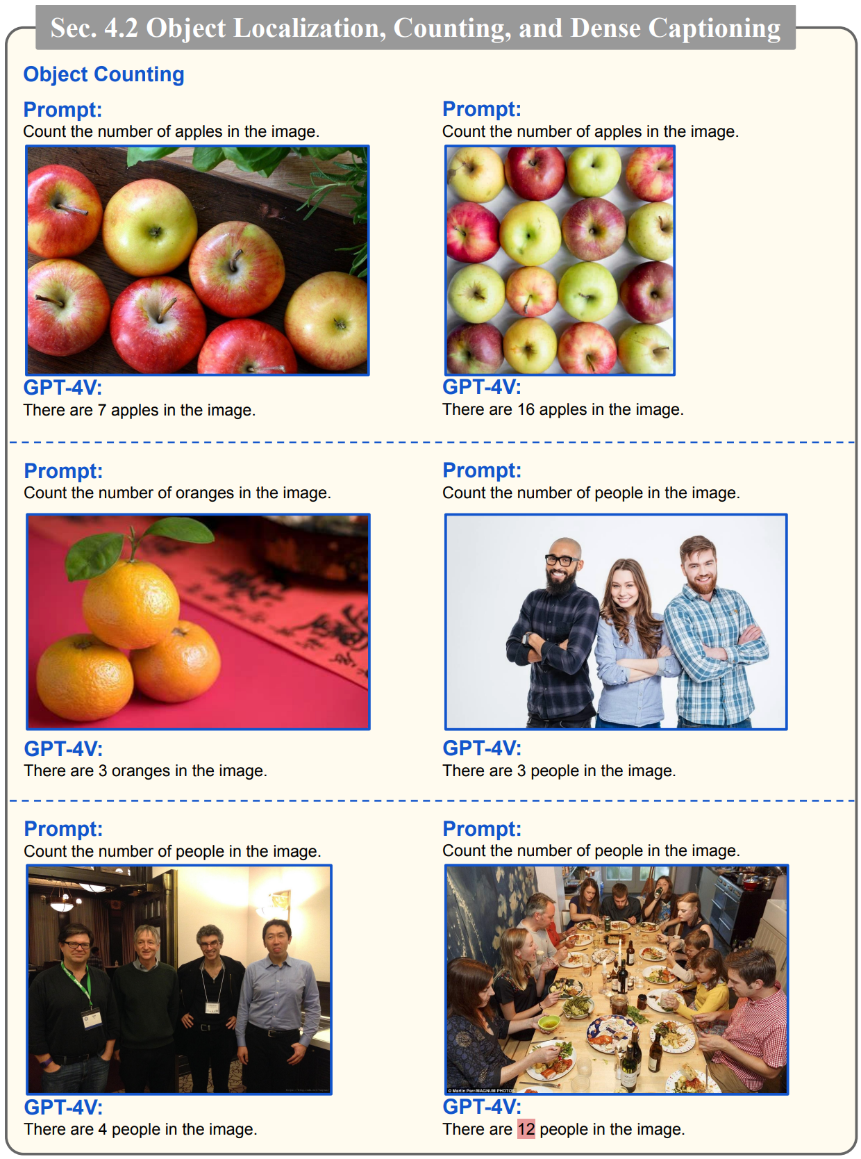 - 아래 예시에서는 이미지속 사물의 숫자를 세는 예시입니다. 마지막 사진에서 실제로는 10명이지만, 12명으로 인식하는 것을 볼 수 있는데요. 물체가 가려지거나 장면이 복잡하면 계산 과정에서 오류가 있는 것으로 보이며, 이는 프롬프트의 기법에 대한 추가 조사가 필요하다고 합니다.