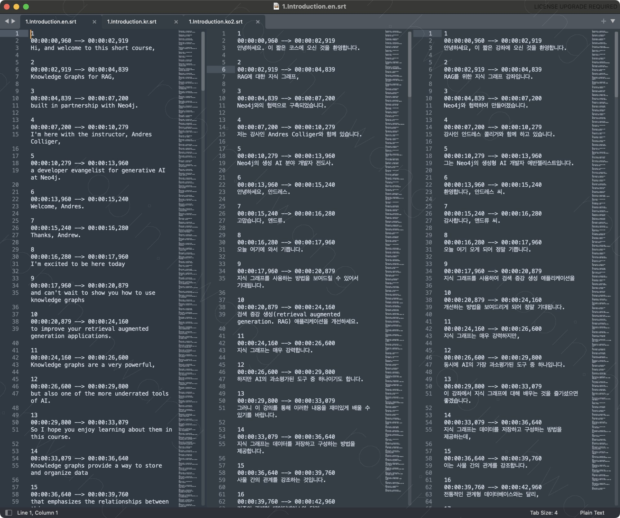 한글 자막을 생성할 때, 자막의 길이를 40자 이내로 조정해 가독성을 높여 보았습니다. 자막이 너무 길 경우에는 적절히 나누어 타이밍에 맞게 조정해 주어, 시청자의 집중을 방해하지 않고 자연스럽게 자막을 읽을 수 있게끔 했습니다. 또한, 한 문장에서 여러 개의 자막으로 나뉘는 경우에도 문장 흐름이 끊기지 않도록 신경을 썼습니다.