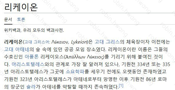 전문용어의 경우에 다르게 표현이 되었는데요. 아래 스크린샷과 같이 Lyceum 이 '라이시움'과 '리케이온' 으로 각각 번역이 되었는데, 찾아보니 둘 다 쓰이는 표현으로 확인이 됩니다.