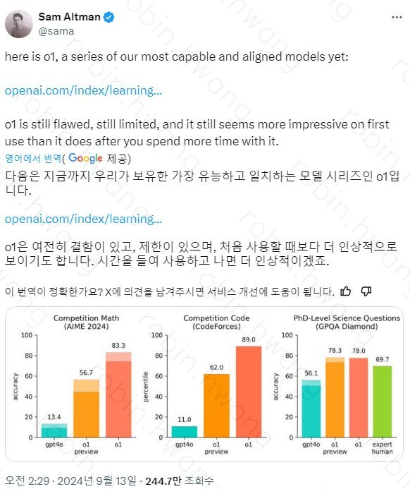 샘 알트만은 아래와 같은 트윗을 통해 미국 수학올림피아드에 준하는 AIME(American Invitational Mathematics Examination) 시험에서 기존 GPT4o가 13.4점을 받은 반면, o1-preview는 56.7점, o1은 83.3점이라고 밝히며 수학에서의 o1 성능이 월등하게 올랐음을 알렸습니다. 뿐만 아니라 CodeForce 점수를 통해 프래그래밍 영역도 크게 올랐으며, GPQA (Google-Proof Q&A) 를 통해 과학, 생물학, 물리학, 화학 분야에서도 AI 추론능력이 크게 올랐음을 알렸습니다.