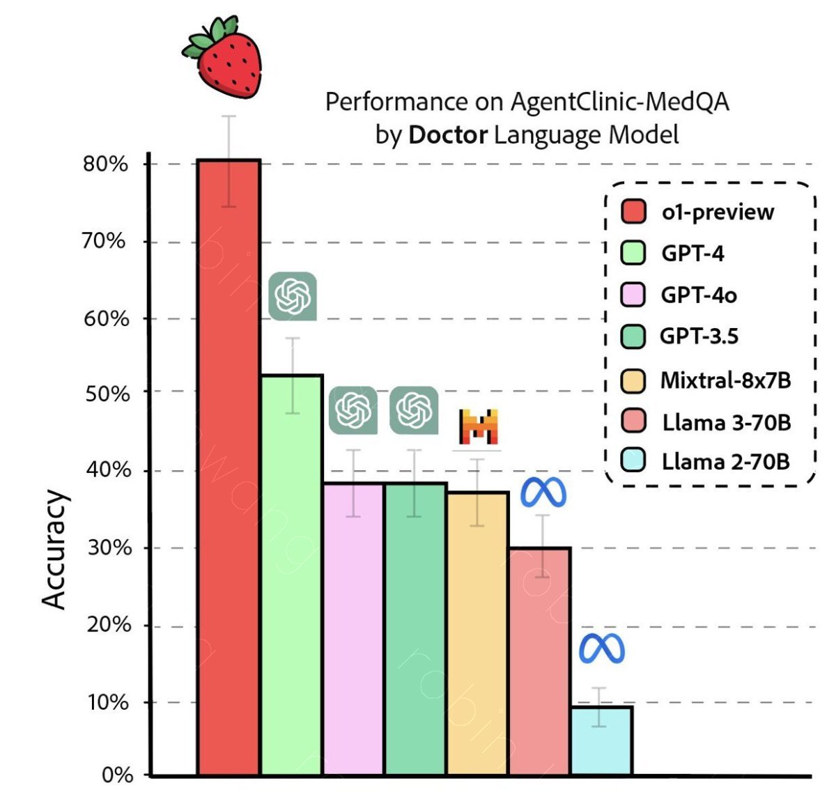 이는 어제 미리보기로 공개된 OpenAI의 o-1 모델(일명 '스트로베리' 모델)의 대대적인 성능 도약에 의해 강조됩니다. 이 모델은 특수 의료 데이터 세트(AgentClinic-MedQA)에서 매우 우수한 성능을 보이며 GPT-4o를 크게 능가합니다. 복잡한 의료 정보를 처리하고, 정확한 진단을 제공하고, 의학적 조언을 제공하고, 치료를 추천하는 AI의 빠른 발전은 가속화될 것입니다.