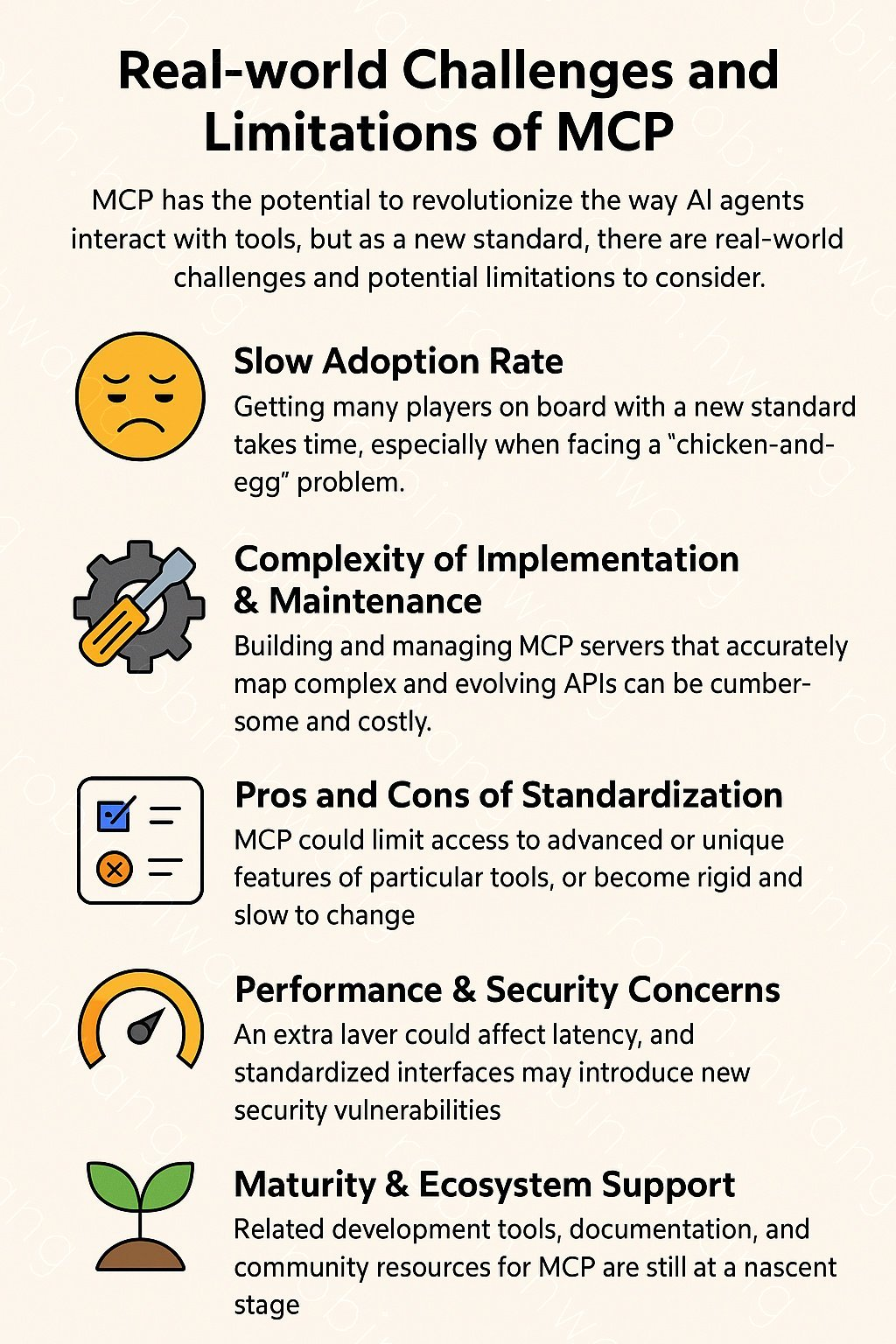 MCP가 이상적인 솔루션처럼 보일 수 있지만, 성공적인 정착과 확산을 위해서는 다음과 같은 현실적인 문제들을 해결해야 합니다.