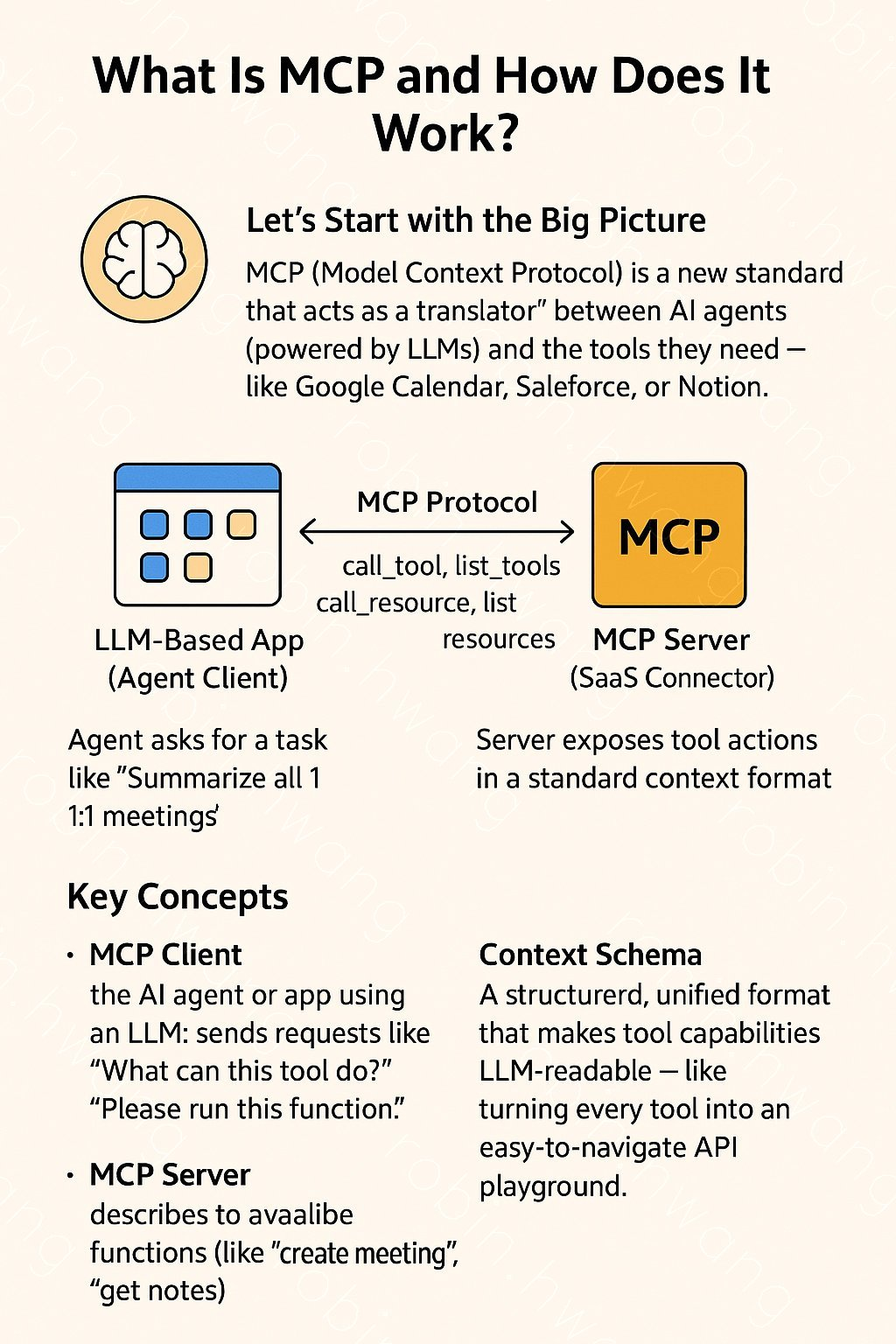 MCP (Model Context Protocol)는 AI 에이전트(LLM 기반)와 그들이 사용해야 하는 도구(Google Calendar, Salesforce, Notion 등) 사이에서 번역가 역할을 하는 새로운 표준입니다.