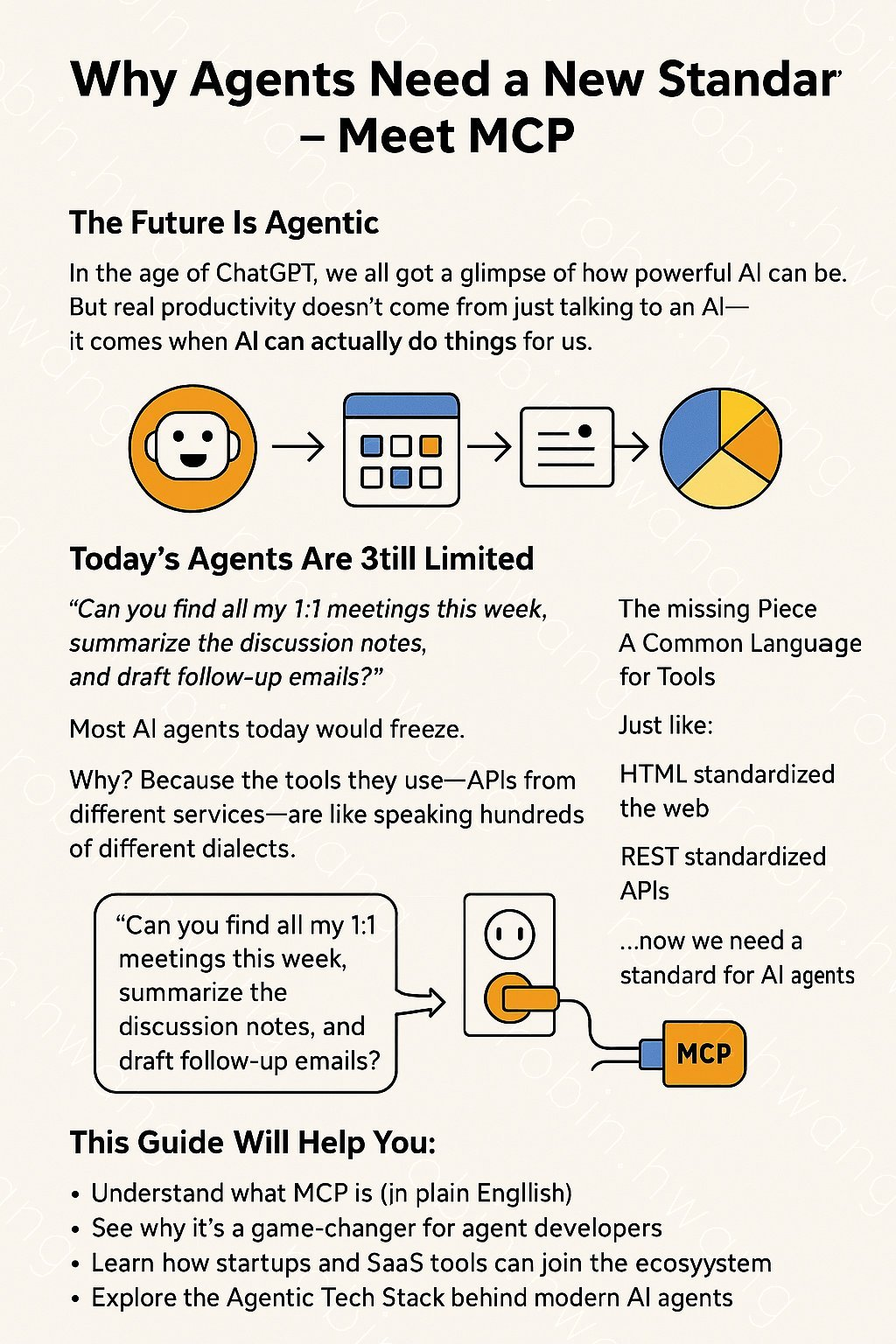 이 자료는 AI 에이전트가 Google Calendar, Salesforce와 같은 다양한 외부 도구(API)를 사용하는 데 어려움을 겪는 현재의 문제를 지적합니다. 이를 해결하기 위한 새로운 표준 프로토콜인 MCP(Model Context Protocol)를 소개하며, MCP가 어떻게 AI 에이전트와 도구 간의 '공통 언어' 역할을 하여 상호작용을 원활하게 하는지 설명합니다. 또한, 개발자와 SaaS 기업이 MCP 생태계에 참여하여 더 강력하고 확장 가능한 AI 에이전트를 구축하는 방법을 안내합니다.