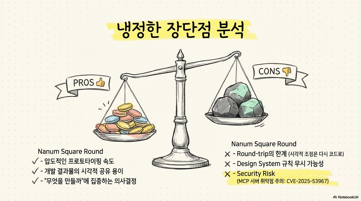 장기 (1~2년): 디자인-개발 경계의 더욱 희미화. AI 네이티브 디자인 도구의 등장. 실시간 양방향 디자인-코드 동기화 실현.