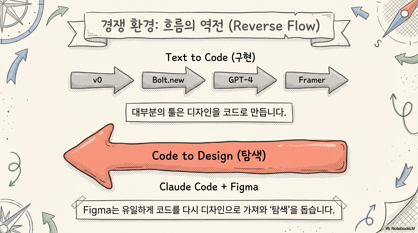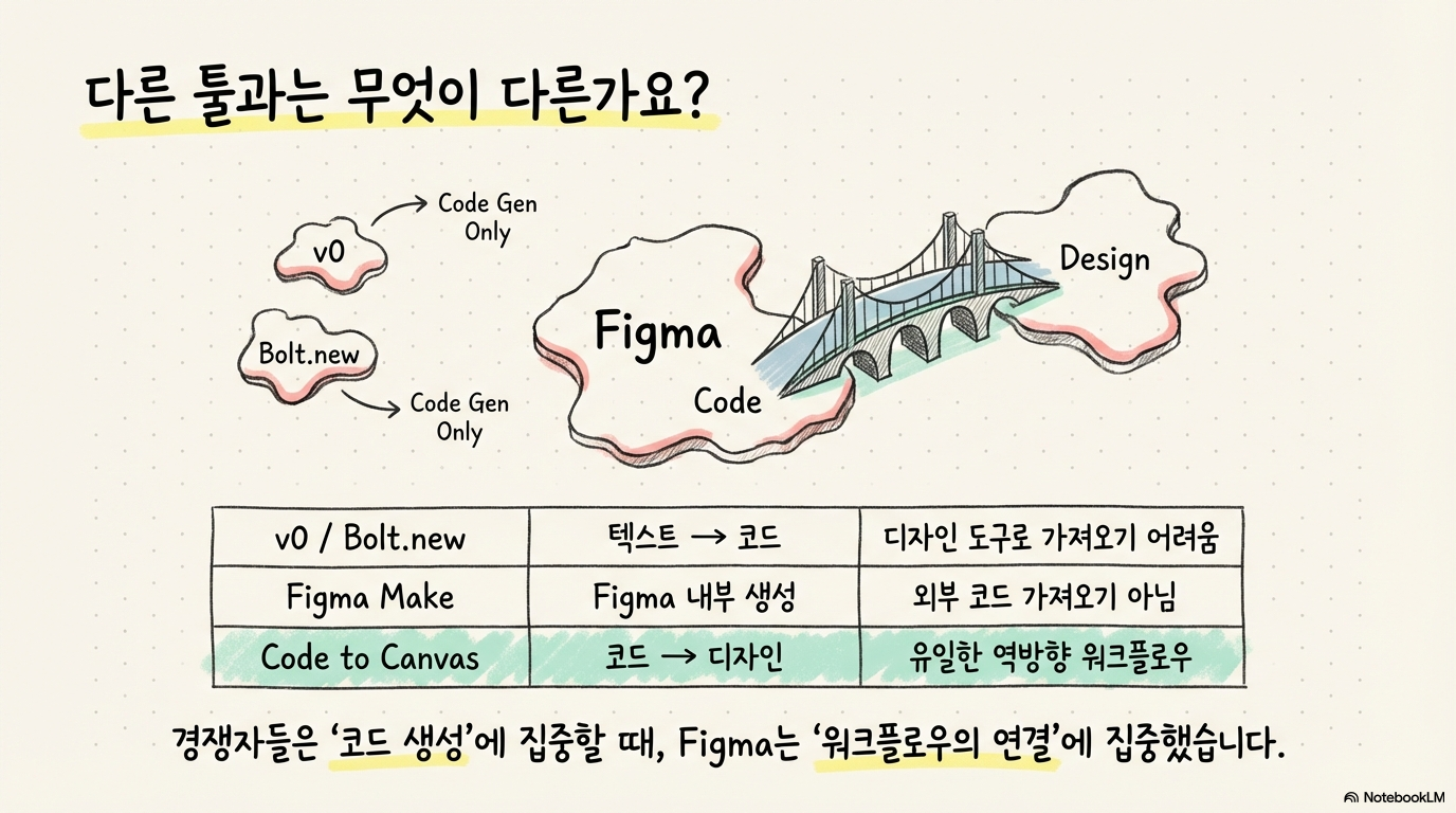 다른 경쟁 제품들이 텍스트/이미지 → 코드 방향에 초점을 맞추는 반면, Code to Canvas는 코드 → 디자인 방향을 제공한다. 이는 기존 경쟁 구도와 다른 차원의 가치를 제안한다: